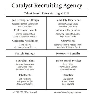 P. 737.530.4425 E. sunny@catalystrecruitingagency.com Reach out to us for Rates for Direct Hire Placement.