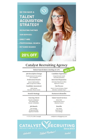 Leave it up to the Pros at Catalyst Recruiting Agency to not only Attract but Assess the right talent saving you Resources in both Time and Money. We offer competitive rates and savings that are hard to pass up.