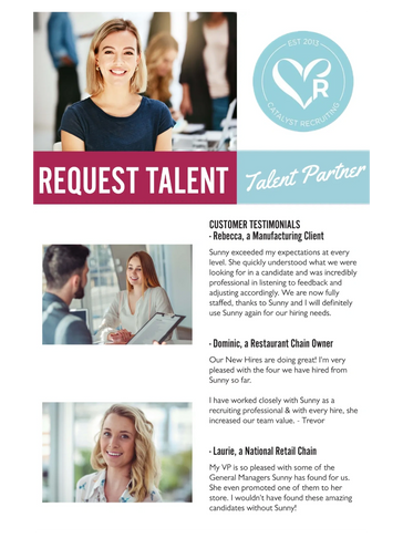 Sunny, the Chief Recruiting Officer at Catalyst has placed over 1000 candidates in various roles since she began recruiting in the late 90s. She brings over 20+ years of expertise and offers competitive rates and excellent talent choices. The types of roles we Recruit for range from: Corporate, Technical, Administrative, Marketing, Sales, Customer Service, Hospitality, Technical, Engineering, Product Management, Software Development, Restaurant, Retail and more.